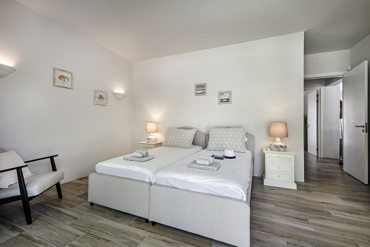 The villa has 4 ensuite bedrooms. Downstairs you have 2 bedrooms. 1 which opens up to the back of the house is a twin (can be double) room with bedside units, air con, a large wardrobe and ensuite with walk-in shower.